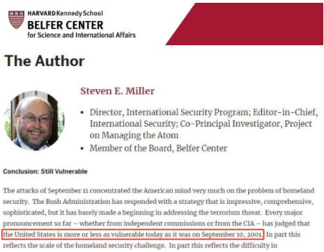 △哈佛大学肯尼迪政府管理学院贝尔福中心国际安全研究项目主任史蒂文·E·米勒发文指出,“9·11”事件让美国人的注意力集中在“国土安全”问题上。但国土安全部的设立没有解决任何问题。迄今为止,无论是来自独立委员会还是来自CIA的重大声明,都指出美国的今天与20年前一样脆弱。