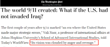 △《华盛顿邮报》:约翰斯·霍普金斯大学高级国际研究学院国际事务教授瓦利·纳斯尔认为,“9·11”事件发生后的头几年标志着“美国犯下重大战略错误的时代”,“它的愿景被愤怒和报复所笼罩”。